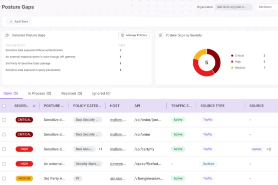 보안 상태 거버넌스 엔진은 IT 생태계 내의 API 위험을 분석합니다. 위험 우선순위는 비즈니스 영향을 기준으로 결정되므로 조직이 가장 시급한 취약점의 해결에 집중할 수 있습니다. 보안 상태 확인 기능은 API 설계 단계에서 CI/CD 파이프라인에 적용할 수 있으므로 DevSecOps 사례에 적합하게 신속히 조치할 수 있습니다.
