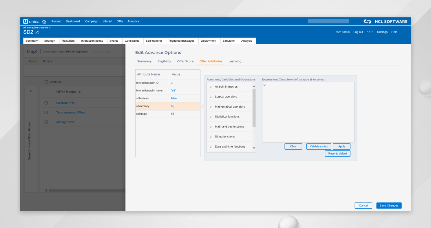 Each Offer rule can be customized using the functionalities available on the advanced options, like setting the Eligibility and Score predicates, applying learning Models, or parameterizing the offer attributes.