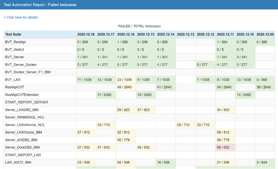 The latest results of the automation suites are available on our Jenkins site and they are gathered in theAggregate Test Report. The Aggregate Test Report is a giant matrix where each row represents a Jenkins job that groups a list of test scenarios belonging to a specific suite and the columns correspond to the date when the Jenkins job runs. The color of each cell of the Aggregate Test Report is updated each time the Jenkins job completes its daily or weekly run. The color indicates the percentage of failed test cases with respect to the total number of them.