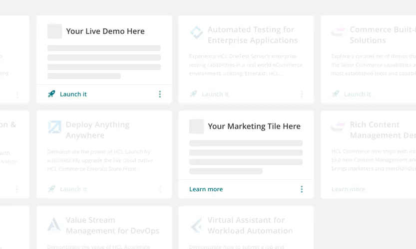 Post a tile in the HCLSoftware Marketplace catalog about your product and how it integrates with HCLSoftware. You provide the text, images, and links that make up your catalog page. Optionally, if you have an integration with one or more HCLSoftware products, Marketplace’s onboarding team can help make it possible for users to experience your product ‘hands-on’ in a Marketplace sandbox. HCLSoftware Marketplace uses Kubernetes to deploy partners’ HCLSoftware-compatible applications and add-ons.