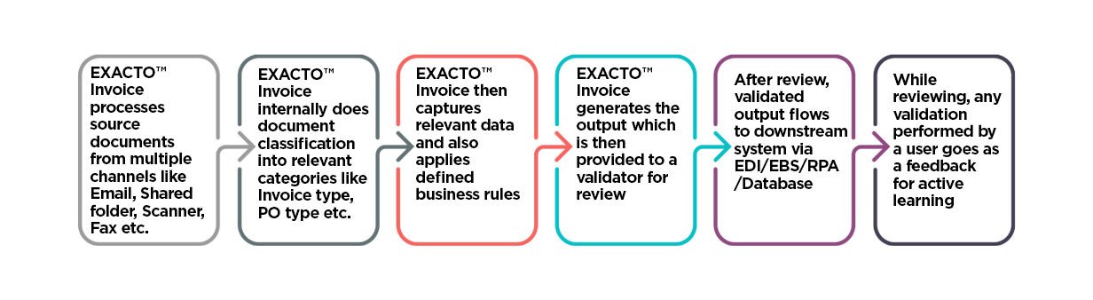 EXACTO ™ Invoice - это запатентованная HCL платформа обработки документов на основе искусственного интеллекта и НЛП с глубоким обучением, разработанная специально для сбора данных из счетов-фактур, квитанций и заказов на поставку. Полная интеграция с несколькими источниками, EXACTO ™ Invoice может обрабатывать документы на более чем 13 языках и предоставляет возможности оцифровки классификации документов на основе AI / ML.